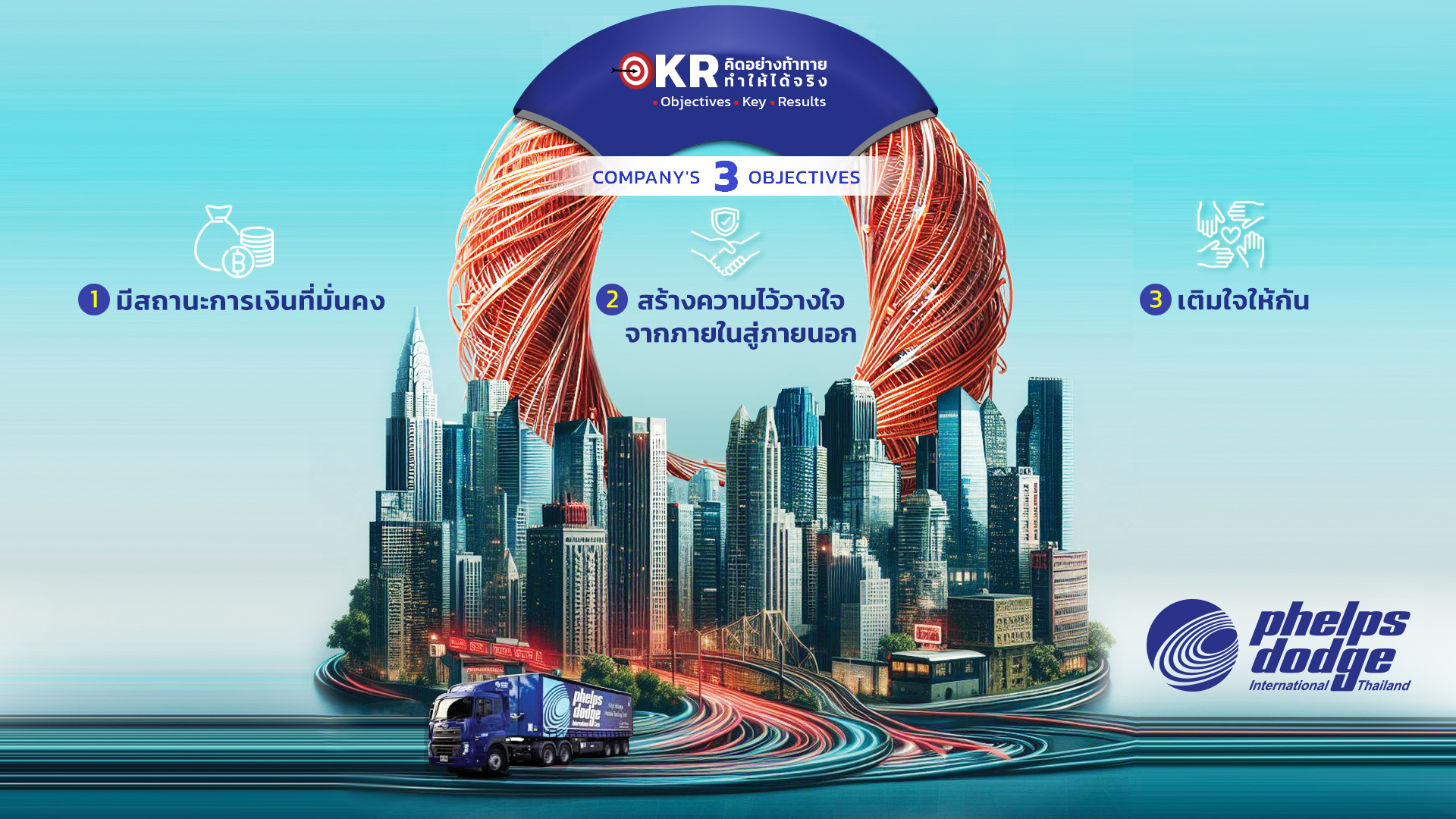 The central cable image symbolizes strength and connectivity, reflecting Phelps Dodge’s core business of powering industries. The cityscape signifies growth and ambition, highlighting the company’s impact on urban development. Bright, flowing lines and gradients suggest progress and innovation, while the prominently displayed Phelps Dodge logo reinforces brand identity and pride, underscoring the company’s heritage and reputation.